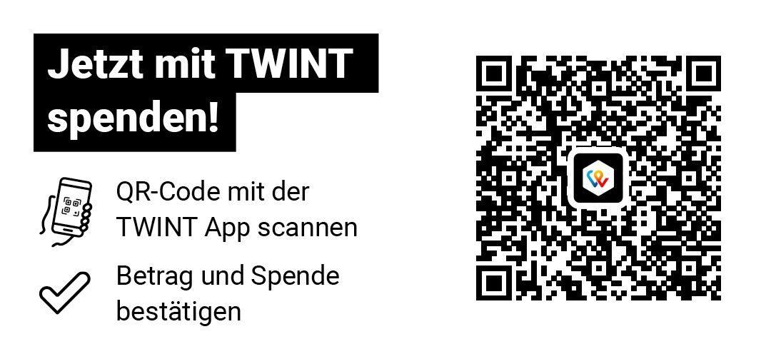 • Mit einer einmaligen Spende auf das Spendenkonto per Twint oder per Überweisung: